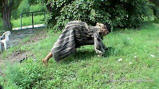 MILF in a short dress with a giant butt pissing outdoors while standing doggy style and her piss gets on her pantyhose gam